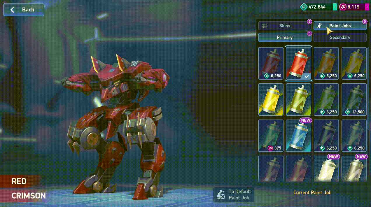 Зверніть увагу: Розфарбування застосовуються до базової моделі Меха та змінюють лише її. Ви не можете застосовувати Розфарбування до Скінів, оскільки Скіни мають власні фіксовані текстури та дизайн.
